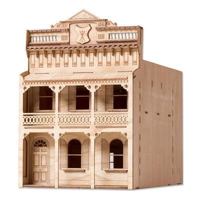 This model is based on houses found in and around, East Melbourne. This particular house had a stucco front and a hipped slate roof. An ornate balustrade parapet was complemented with a cast iron verandah details and balcony.